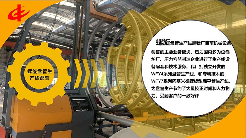 螺旋盤管生產線是我廠目前機械設備銷售的主要業務板塊,已為國內多為位鍋爐廠、壓力容器制造企業進行了生產線設備配套和技術服務。我廠擁獨立開發的WFY4系列盤管生產線,和擁有專利技術的WFY7系列阿基米德螺旋型扁平管生產線,為盤管生產節約了大量校正時間和人力物力,受到客戶的一致好評。
